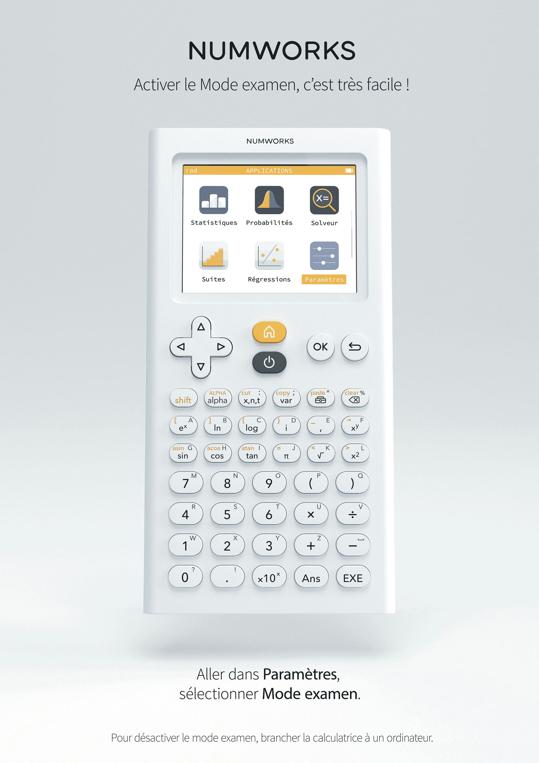 La calculatrice graphique NumWorks est autorisée aux examens de l’enseignement scolaire français et dispose du mode examen.